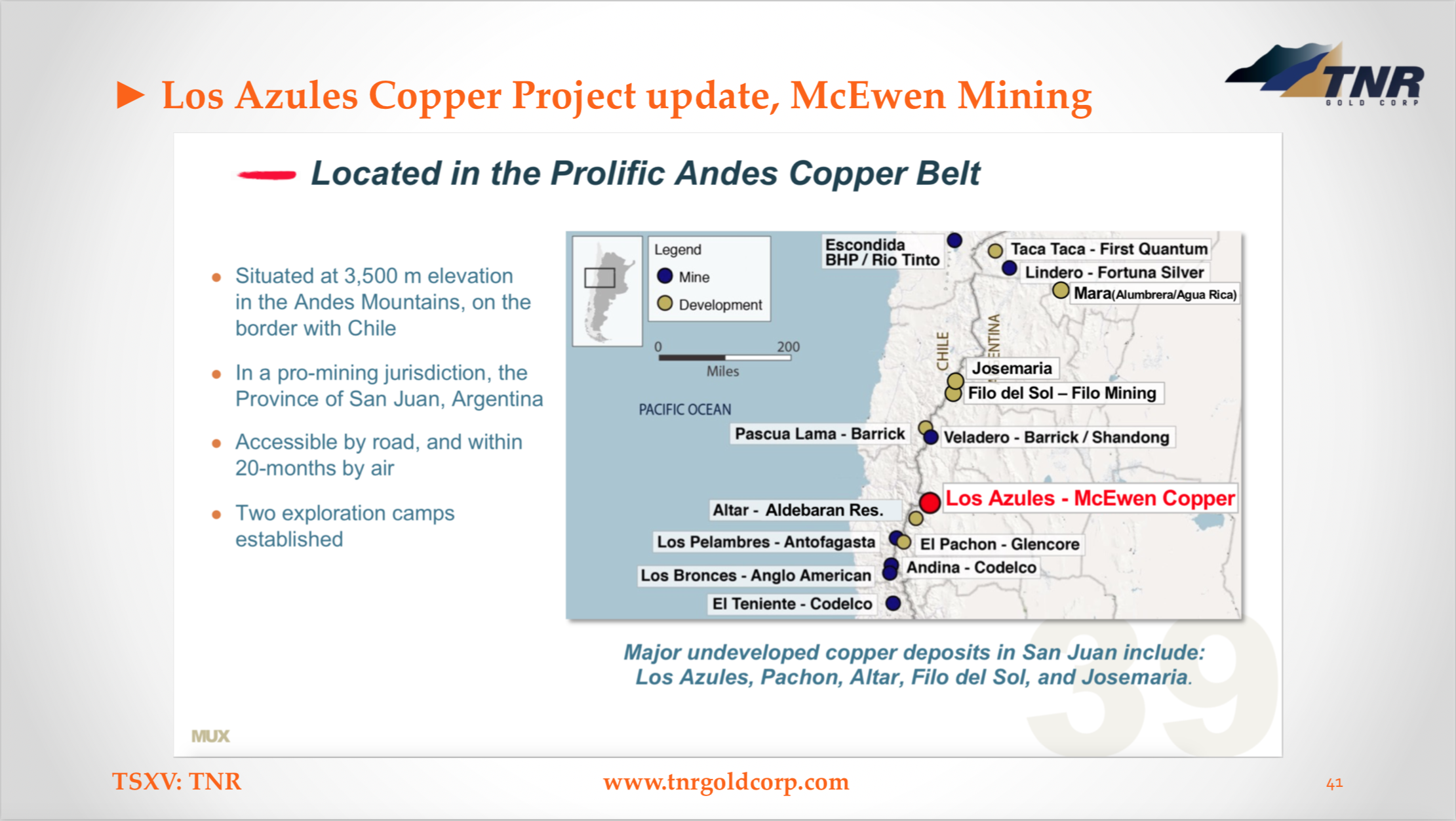 “TNR Gold holds a 0.4% NSR royalty on the entire Los Azules Copper Project (TNR holds a 0.04% on behalf of a shareholder). TNR Gold does not have to contribute any capital for the development of Los Azules. The essence of our business model is to have industry leaders like McEwen Mining as operators on the projects that will potentially generate royalty cashflows to contribute significant value for our shareholders.”