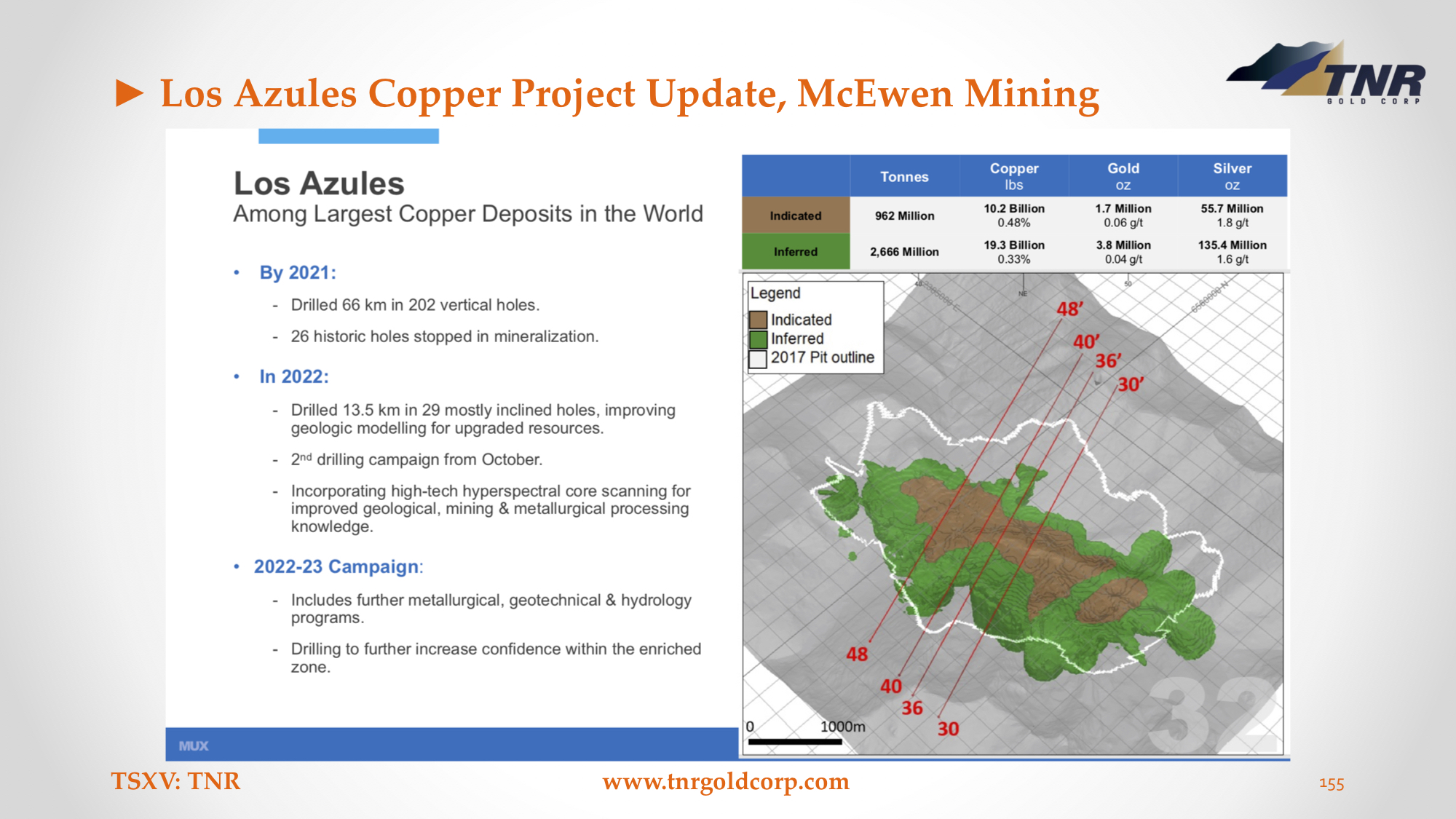 McEwen Mining holds 1.25% NSR Royalty on Los Azules Copper which could be valued at USD$100 million based on the Royalty deal made by Osisko Gold Royalties, according to Rob McEwen. TNR Gold Holds 0.4% NSR Royalty on the giant Los Azules Copper, Gold and Silver project with McEwen Mining, of which 0.04% of the 0.4% NSR Royalty is held on behalf of a shareholder.
