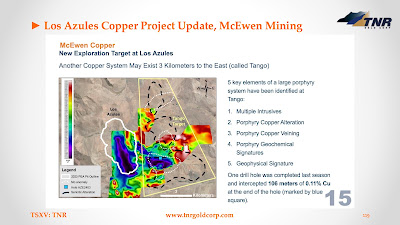 Los Azules was ranked in the top ten largest undeveloped copper deposits in the world by Mining Intelligence (2022). TNR Gold does not have to contribute any capital for the development of the Los Azules Project. The essence of our business model is to have industry leaders like McEwen Mining as operators on the projects that will potentially generate royalty cashflows to contribute significant value for our shareholders.”